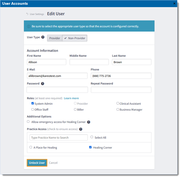 - Find the provider user and click Unlock. The Unlock User pop-up opens.